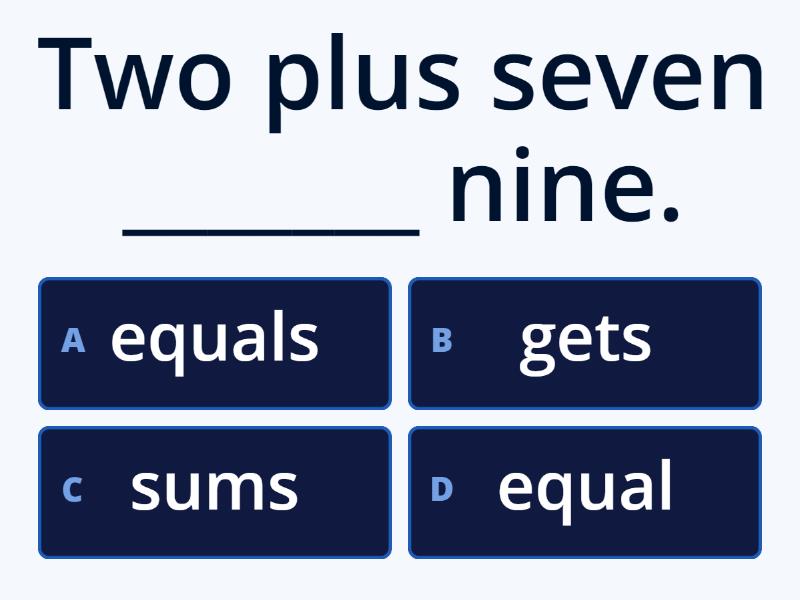 1) Two plus seven _______ nine. a) equals b) gets c) sums d) equal 2) The _______ root of nine is three. a) squared b) square 3) The lowest _______ number is two. a) even b) odd 4) Twelve ________ three equals nine. a) minus b) divided by 5) Ten ______ two equals five. a) split in b) divided by 6) Three ______ three equals nine. a) by b) times 7) An angle of 90° is a _______ angle. a) right b) straight 8) You would measure the volume of a swimming pool in ______ metres.  a) cubic b) square 9) A _______ chart is a circle divided into sections to show particular amounts in relation to a whole. a) cake b) pie 10) A _______ diagram shows the relationships between sets of items. a) Circles b) Venn 11) First, second, and third are ______ numbers. a) cardinal b) ordinal 12) A quarter expressed as a _______ is 0.25. a) decimal b) fraction 13) The radius of a circle equals half the length of the _______. a) diameter b) axis 14) In 2006, Akira Haraguchi set an unofficial world record by reciting 100,000 digits of ________. a) figures b) pi 15) A _______ is 0.9144 metres. a) gallon b) yard 16) A ______ is around 4.5 litres. a) gallon b) pint 17) An ______ is 28.35 grams. a) inch b) ounce 18) Whatever you do, don’t give in to him. If you give him an inch, he’ll take a _______ . a) yard b) mile 19) Can you help me with my suitcase? It weighs a ______. a) ton b) thousand kilograms 20) I wouldn’t trust him _______. He’s always lying! a) an inch b) a foot