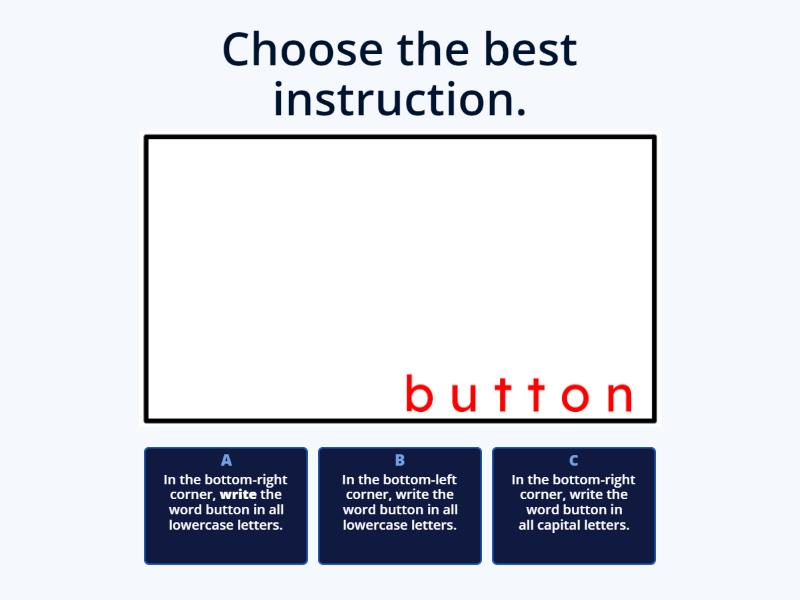 1) Choose the best instruction. a) In the bottom-right corner, write the word button in all lowercase letters. b) In the bottom-left corner, write the word button in all lowercase letters. c) In the bottom-right corner, write the word button in all capital letters. 2) Choose the best instruction. a) Circle the second letter. b) Circle the third letter. c) Circle the first letter. 3) Choose the best instruction. a) Underline the second t. b) Underline the first t. c) Underline the third letter. 4) Choose the best instruction. a) Draw three squares above the word button. b) Draw squares three above the word button. c) Draw three squares below the word button. 5) Choose the best instruction. a) Check inside the first square. b) Check inside the second square. c) Check inside the third square. 6) Choose the best instruction. a) Cross out the letter o. b) Cross out the third box. c) Cross out the sixth letter.