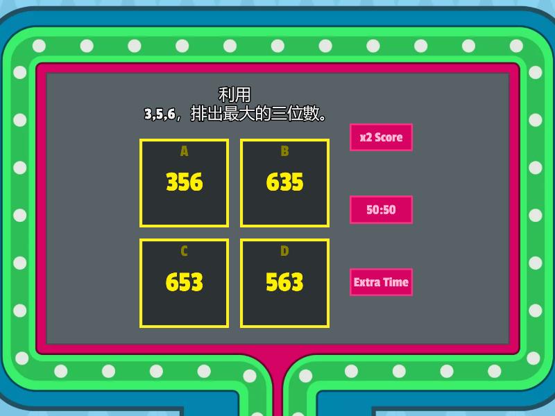 1) 利用 3,5,6,排出最大的三位數。 a) 356 b) 635 c) 653 d) 563 2) 利用 3,7,8,排出最大的三位偶數。 a) 873 b) 783 c) 378 d) 738 3) 利用 3,5,6,排出最大的三位奇數。 a) 635 b) 653 c) 536 d) 365 4) 以下那一項是順數? a) 456, 458, 460, 462, 464, 466 b) 750, 725, 700, 675, 650, 625 c) 303, 301, 299, 297, 295, 293 d) 800, 700, 600, 500, 400, 300 5) 以下那一項是倒數? a) 105, 110, 115, 120, 125, 130 b) 988, 984, 980, 976, 972, 968 c) 343, 344, 345, 346, 347, 348 d) 110, 130, 150, 170, 190, 210 6) 依規律填一填。 25, _______,75,100,125,150 a) 30 b) 70 c) 40 d) 50 7) 依規律填一填。 250,300,350, ______,450,500 a) 375 b) 400 c) 425 d) 550 8) 依規律填一填。 30, _______, 90, 120, 150, 180 a) 50 b) 60 c) 70 d) 80 9) 每盒紙巾有100張。每100個一組數數,有 _______個100,共有紙巾 _________張。 a) 4, 300 b) 30, 300 c) 3, 300 d) 3, 3000 10) 每包薯片有25克。 每25個一組數數,有 ______個25,共有薯片 ______克。 a) 5, 125 b) 5, 100 c) 5, 150 d) 5, 75 11) 每本書有25頁,共有_____頁。 以每50個一組數數,有 _____個50。。 a) 125, 2 b) 100, 1 c) 150, 3 d) 100, 2 12) 4個50是 ________。 a) 100 b) 200 c) 300 d) 150 13) 7個25是 ________。 a) 125 b) 150 c) 175 d) 200 14) 7個20是 ________。 a) 80 b) 100 c) 120 d) 140 15) 每包薯條50條,日嵐吃了2包多20條,他共吃了薯條多少條? a) 100 b) 120 c) 200 d) 220 16) 10 個 20 是 200, 12 個 20 是多少? a) 240 b) 220 c) 180 d) 212 17) 用中國數字寫出左圖算柱所表示的數。 a) 三百七十四 b) 四百八十三 c) 四百七十三 d) 三百八十三 18) 把以下各數由大至小排列出來。 (用阿拉伯數字作答) (a) 圖片 (b) 438 (c) 五百三十二 a) 五百三十二,五百二十四,四百三十八 b) 四百三十八,五百三十二,五百二十四 c) 438, 524, 532 d) 532, 524, 438 19) 404 ,________, 409 中間的數是一個三位偶數,這個數可能是 _______或 _______。 a) 406, 407 b) 406, 408 c) 405, 407 d) 405, 408 20) 挑戰題😁 有一個三位數,它比400大,但比500小,它在百位和十位的數字相同,十位和個位數字的和是9,這個三位數是? a) 554 b) 445 c) 443 d) 454