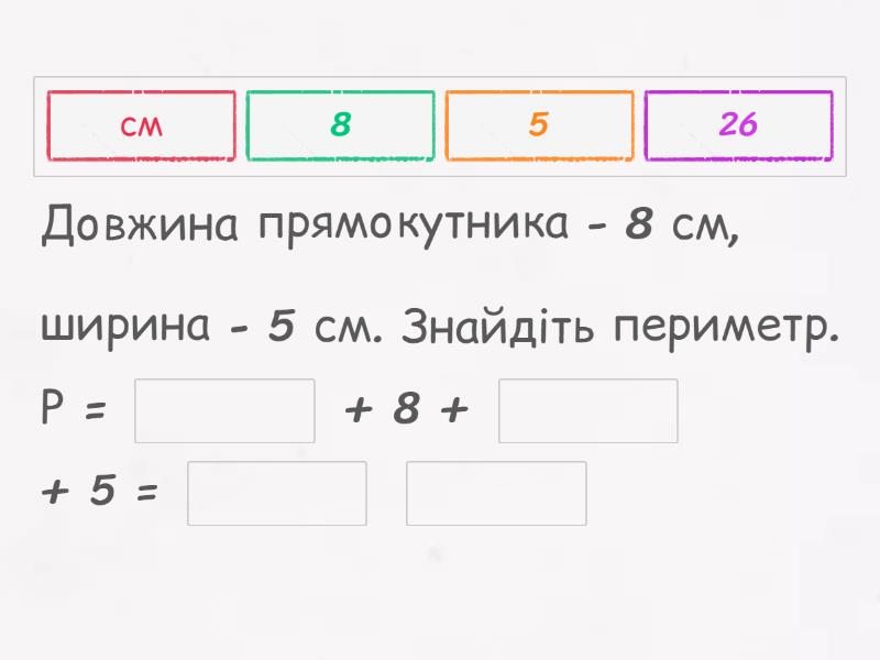 Довжина прямокутника - 8 см, ширина - 5 см. Знайдіть периметр. Р = ____ + 8 + ____ + 5 = ____ ____