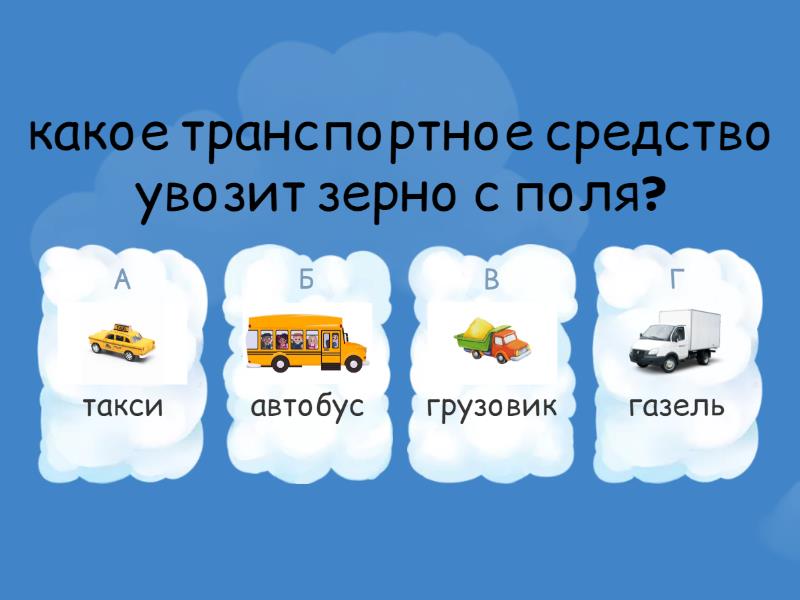 1) какое транспортное средство увозит зерно с поля? a) такси b) автобус c) грузовик d) газель 2) как называется профессия человека, который убирает зерно с поля? a) пекарь b) учитель c) комбайнер d) пожарный 3) назови профессию человека, который печет хлеб? a) пекарь b) продавец c) стюардесса d) строитель 4) что не относится к хлебобулочным изделиям? a) хлеб b) картофель фри c) батон d) ватрушка 5) из каких зерен делают пшеничную муку? a) рожь b) овес c) гречка d) пшеница 6) как называется место где пекут хлеб? a) детский сад b) пекарня c) магазин d) театр