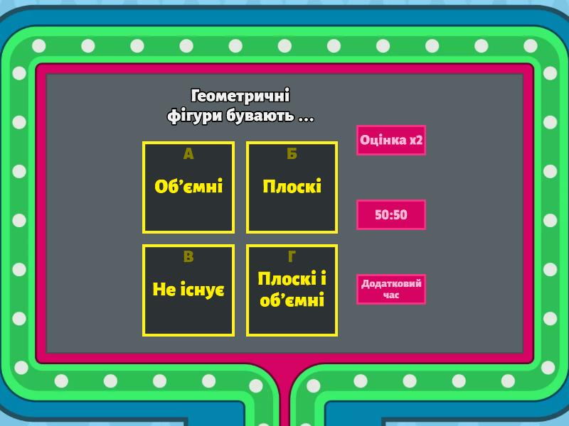 1) Геометричні фігури бувають ... a) Об'ємні b) Плоскі c) Не існує d) Плоскі і об'ємні 2) Число 2 менше ніж 3 a) Так b) Ні 3) 3 це як 2+1 ? a) Так b) Ні 4) 2 це як 1+1 ? a) Ні b) Так 5) Чи дорінює кількість об'єктів? a) Так b) Ні 6) Чи відповідає кількість предметів числу? a) Так b) Ні