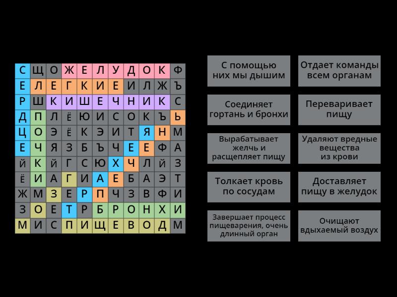 Печень - Вырабатывает желчь и расщепляет пищу, Почки - Удаляют вредные вещества из крови, Сердце - Толкает кровь по сосудам, Мозг - Отдает команды всем органам, Желудок - Переваривает пищу, Кишечник - Завершает процесс пищеварения, очень длинный орган, Легкие - С помощью них мы дышим, Бронхи - Очищают вдыхаемый воздух, Трахея - Соединяет гортань и бронхи, Пищевод - Доставляет пищу в желудок,