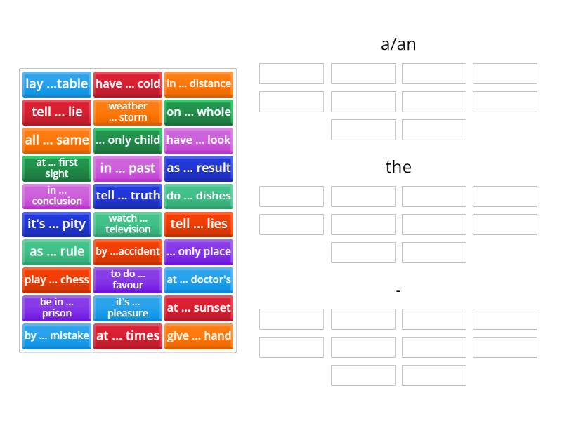 a/an: ... only child, as ... rule, as ... result, it's ... pity, have ... cold, have ... look, give ... hand, it's ... pleasure, tell ... lie , to do ... favour, the: all ... same, at ... doctor's, on ... whole, tell ... truth, weather ... storm, lay ...table, in ... distance, ... only place, in ... past, do ... dishes, -: at ... sunset, at ... first sight, at ... times, by ...accident, in ... conclusion, play ... chess, tell ... lies, watch ... television, by ... mistake, be in ... prison,
