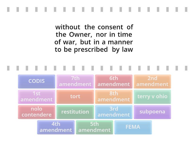 3rd amendment - without the consent of the Owner, nor in time of war, but in a manner to be prescribed by law, 6th amendment - grants citizens the right to a jury composed of impartial members drawn from the local community, 2nd amendment - A well regulated Militia, being necessary to the security of a free State, the right of the people to keep and bear Arms, shall not be infringed, 5th amendment - guarantees the right to a grand jury, forbids “double jeopardy,” and protects against self-incrimination, 1st amendment - Congress make no law respecting an establishment of religion or prohibiting its free exercise, 4th amendment - Amendment, protects people from unreasonable searches and seizures by the government, terry v ohio - police using a “stop and frisk” procedure are within constitutional bounds as officers of the law, tort - an act or omission that gives rise to injury or harm to another and amounts to a civil wrong for which courts impose liability, subpoena - a formal written order that requires a person to appear before a court, or other legal proceedings (such as a Congressional hearing), and testify, or produce documentation, FEMA - An agency within the U.S. Department of Homeland Security charged with responding to Presidentially-declared disasters, nolo contendere - a plea by which a defendant in a criminal prosecution accepts conviction as though a guilty plea had been entered but does not admit guilt., 8th amendment - Excessive bail shall not be required, nor excessive fines imposed, nor cruel and unusual punishments inflicted, restitution - A legitimate order for restitution is applied during the sentencing of an offender and the amount and manner of payment is determined by the courts, 7th amendment - protects the right for citizens to have a jury trial in federal courts with civil cases where the claim exceeds a certain dollar value, CODIS - blends forensic science and computer technology into a tool that enables federal, state, and local forensic laboratories to exchange and compare DNA profiles electronically,
