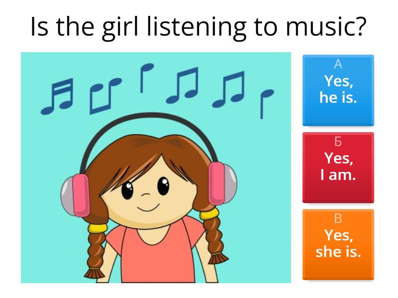 1) Is the girl listening to music? a) Yes, he is. b) Yes, I am. c) Yes, she is. 2) Is the boy painting a picture? a) Yes, he is. b) No, he isn't. c) Yes, she is. 3) Are the boys playing football? a) Yes, I am. b) No, they aren't. c) Yes, they are. 4) Are you dancing? a) No, I am not. b) Yes, I am. c) Yes, he is. 5) Is he taking a photo? a) Yes, I am. b) Yes, he is. c) No, we aren't. 6) Are they swimming? a) No, they aren't. b) Yes, they are. c) No, I am not. 7) Are you riding bikes? a) Yes, I am. b) Yes, we are. c) Yes, he is. 8) Are you sleeping? a) No, I am not. b) Yes, I am. c) No, they aren't. 9) Are you doing homework? a) No, I am not. b) Yes, I am. c) Yes, we are. 10) Are the cats running? a) Yes, we are. b) Yes, they are. c) Yes, it is. 11) Is the dog eating? a) Yes, it is. b) No, it isn't. c) Yes, he is.