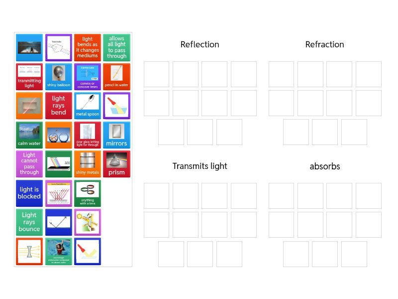 Reflection : Light rays bounce, , shiny metals, mirrors, calm water, , metal spoon, shiny balloon, , , Refraction: pencil in water , light rays bend, anything with a lens, , light bends as it changes mediums, , convex or concave lenes, prism, pool image underwater compared to above water, , , Transmits light: clear glass letting light for through, tranmitting light, , , allows all light to pass through, absorbs: , Light cannot pass through, light is blocked,