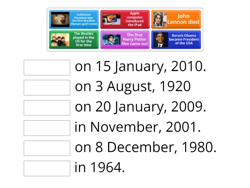 John Lennon died - on 8 December, 1980., The Beatles played in the US for the first time - in 1964., The first Harry Potter film came out - in November, 2001., Barack Obama became President of the USA - on 20 January, 2009. , Apple computer introduced the iPad - on 15 January, 2010., Guilherme Paraense won the first Brazilian Olympic gold medal - on 3 August, 1920,