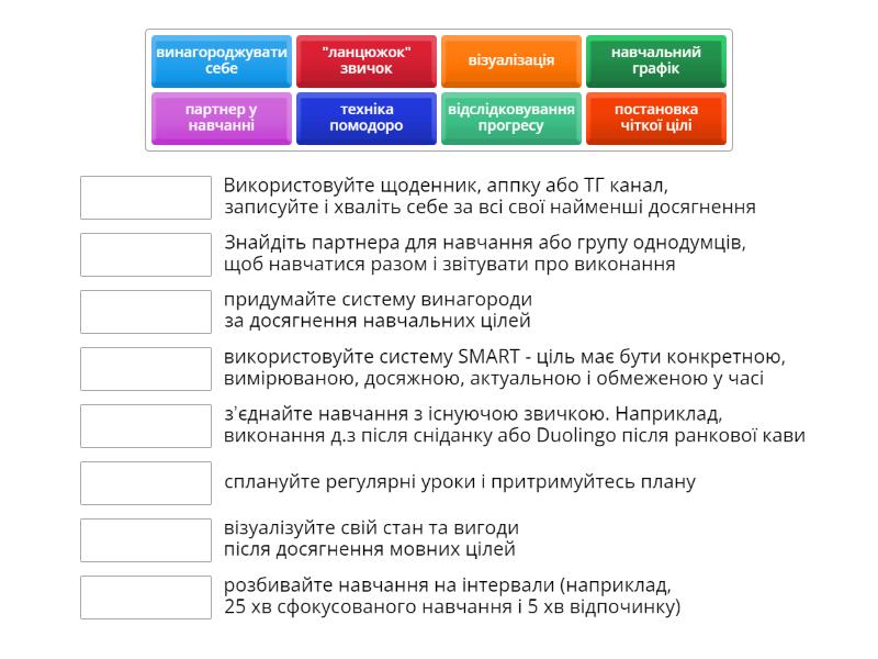 винагороджувати себе - придумайте систему винагороди за досягнення навчальних цілей, техніка помодоро - розбивайте навчання на інтервали (наприклад, 25 хв сфокусованого навчання і 5 хв відпочинку), "ланцюжок" звичок - зʼєднайте навчання з існуючою звичкою. Наприклад, виконання д.з після сніданку або Duolingo після ранкової кави , візуалізація - візуалізуйте свій стан та вигоди після досягнення мовних цілей, партнер у навчанні - Знайдіть партнера для навчання або групу однодумців, щоб навчатися разом і звітувати про виконання, постановка чіткої цілі - використовуйте систему SMART - ціль має бути конкретною, вимірюваною, досяжною, актуальною і обмеженою у часі, відслідковування прогресу - Використовуйте щоденник, аппку або ТГ канал, записуйте і хваліть себе за всі свої найменші досягнення, навчальний графік - сплануйте регулярні уроки і притримуйтесь плану,