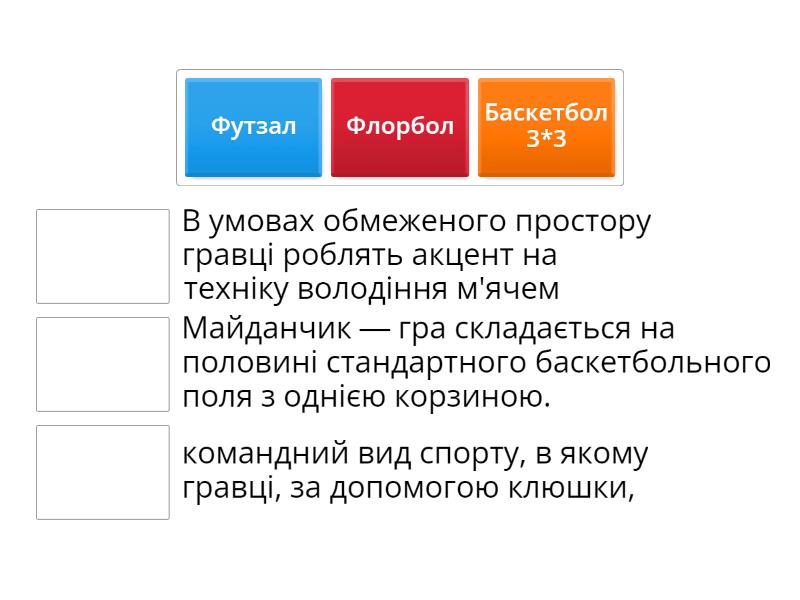 Баскетбол 3*3 - Майданчик — гра складається на половині стандартного баскетбольного поля з однією корзиною., Флорбол - командний вид спорту, в якому гравці, за допомогою клюшки,, Футзал - В умовах обмеженого простору гравці роблять акцент на техніку володіння м'ячем,