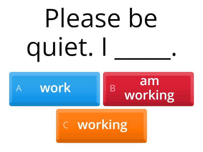 1) Please be quiet. I _____. a) work b) am working c) working 2) A: Is John at home? B: Yes, he's in the kitchen, he _____. a) cook b) is cooking c) is cook 3) A: Where's Ann? B: I ____ . a) not know b) am not knowing c) don't know 4) A: Where's Ann? B: She ____ a shower right now a) have b) is having c) has 5) A: What____? B: She's a dentist. a) does your sister do b) is your sister doing c) your sister does 6) A: You ____ on my foot! B: Oh, I'm sorry! a) stand b) are standing c) are stand 7) It ____, I ____ to go out in the rain. a) rain, am not wanting b) rains, don't want c) is raining, don't want 8) A: Where ____ from? B: Switzerland. a) do you come b) are you come c) you come 9) Listen! Somebody ____ a) comes b) come c) is coming. I am scared. 10) What ____ ? ____? a) is it meaning? Are you understanding? b) does it mean? Do you understand? c) is it mean? Are you understand? 11) Ann ____ happy at the moment. a) doesn't seem b) isn't seeming c) not seeming 12) What ____ about my new shirt? a) are you thinking b) you think c) do you think 13) I ____ of selling my car. Would you like to buy it? a) think b) am thinking c) thinks 14) Who's that man? What ____? a) does he want b) he is wanting c) is he wanting 15) Who's that man? Why ____ at us? a) does he look b) he is looking c) is he looking 16) The dinner ____ very good! I'm sure the taste is good, too. a) is smelling b) smells c) smell 17) ____ that man over there? a) Do you see b) You are see c) Are you seeing 18) She told me her name, but I ____ it now. a) not remember b) am not remembering c) don't remember 19) These gloves are too small, they _____ me. a) aren't fit b) don't fit c) not fit 20) Don't turn the computer off. I ____ to use it. a) need b) am need c) am needing 21) What _________? - He's making invoices. a) What does your dad do? b) What is your dad doing at the moment? c) What's your father's job? 22) What ______? - He's a gardener. a) What does your dad do? b) What is your dad doing at the moment? c) What your dad doing now?
