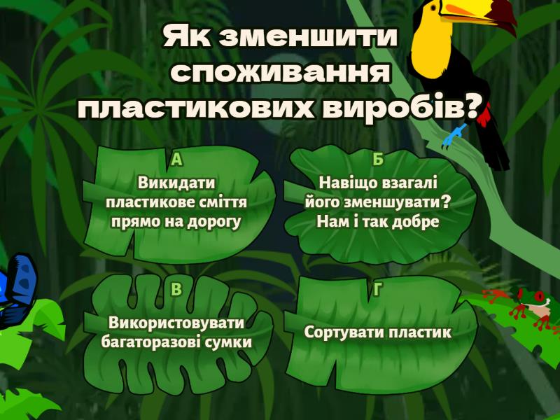 1) Як зменшити споживання пластикових виробів? a) Викидати пластикове сміття прямо на дорогу b) Навіщо взагалі його зменшувати? Нам і так добре c) Використовувати багаторазові сумки  d) Сортувати пластик 2) Як зменшити викиди CO2? a) Їздити на автомобілі без потреби b) Саджати більше дерев c) Не вимикати електроприлади, коли вони не потрібні d) Економити використання води 3) Що таке СО2? a) Вода b) Повітря c) Метал d) Вуглекислий газ 4) Чому екологічна освіта важлива? a) Завдяки цьому ми можемо більше грати в Brawl stars b) Вона не важлива  c) Завдяки їй ми можемо дізнатися як запобігти глобальному потеплінню чи масовому забрудненню нашої планети 5) Які наслідки для екосистеми несе вирубка лісів? a) Збільшення викидів вуглекислого газу b) Ніяких c) Через вирубку лісів знищується багато середовищ існування деяких видів тварин d) Не знаю 6) Ви молодці? a) ТАК!! b) ні