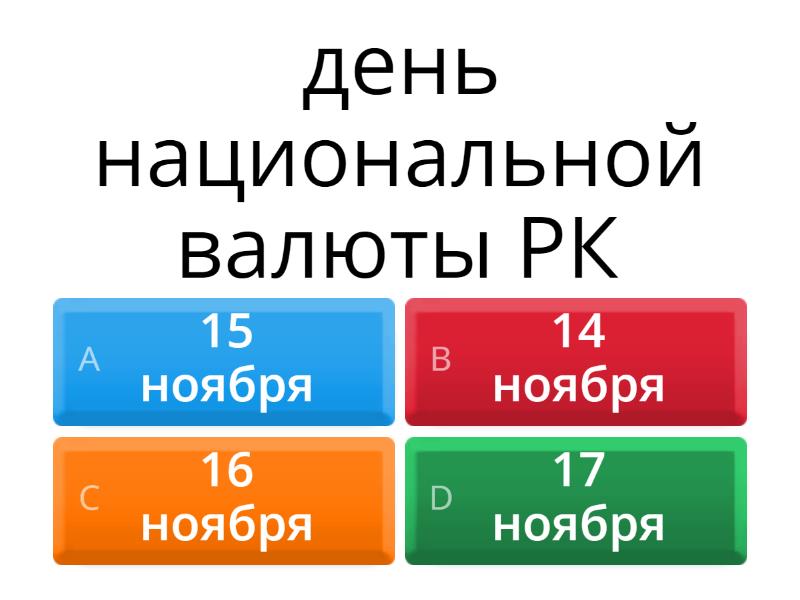 1) день национальной валюты РК a) 15 ноября b) 14 ноября c) 16 ноября d) 17 ноября