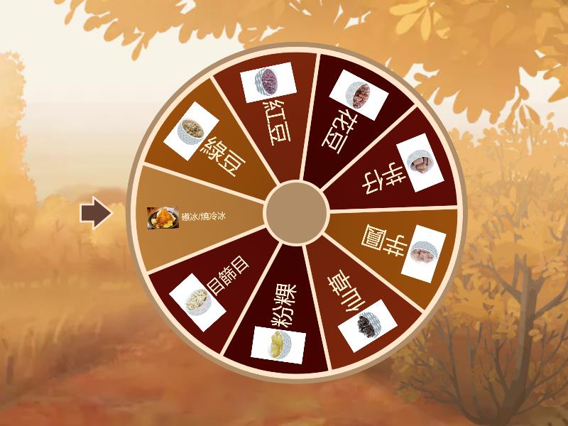 1) 綠豆 2) 紅豆 3) 花豆 4) 芋仔 5) 芋圓 6) 仙草 7) 粉粿 8) 目篩目 9) 礤冰/燒冷冰