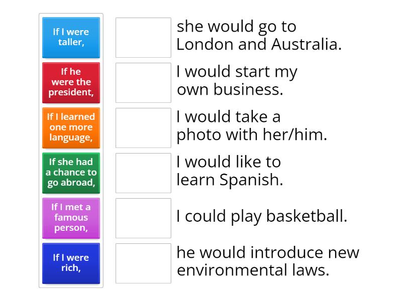 If I were rich, - I would start my own business., If she had a chance to go abroad, - she would go to London and Australia., If I learned one more language, - I would like to learn Spanish., If he were the president, - he would introduce new environmental laws., If I met a famous person, - I would take a photo with her/him., If I were taller, - I could play basketball.,