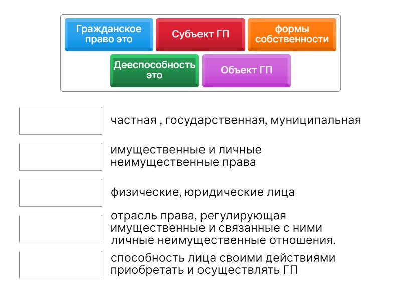 Гражданское право это - отрасль права, регулирующая имущественные и связанные с ними личные неимущественные отношения. , Субъект ГП - физические, юридические лица, Объект ГП - имущественные и личные неимущественные права, Дееспособность это - способность лица своими действиями приобретать и осуществлять ГП, формы собственности - частная , государственная, муниципальная ,