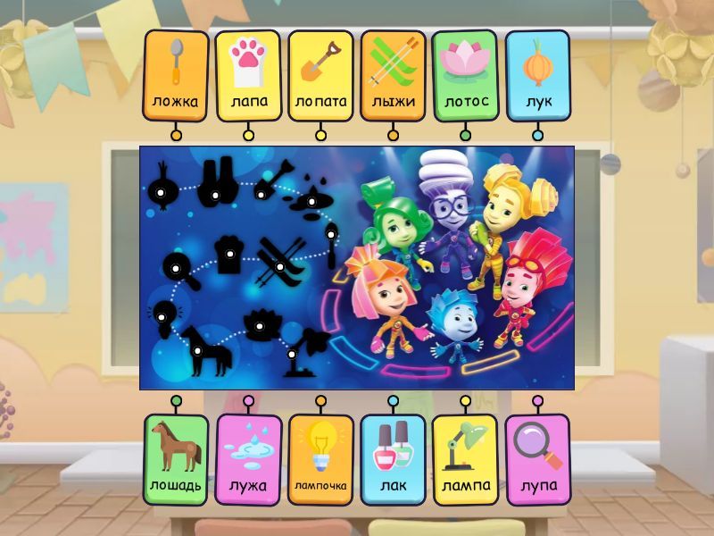 лампочка, лопата, лошадь, лук, лупа, ложка, лампа, лотос, лак, лужа, лыжи, лапа.