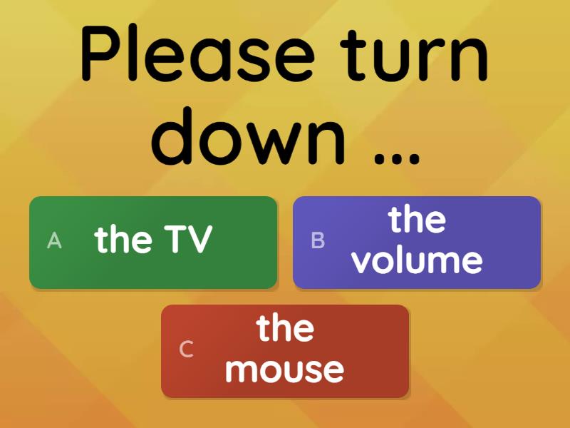 1) Please turn down ... a) the TV b) the volume c) the mouse 2) I need to charge ... . It's dead a) the battery b) this app c) my phone 3) Save electricity ! Switch off  a) to the Internet b) the light c) the TV 4) Did you upload ... ? a) the photographs b) a mouse c) the video 5) I want to download ... a) my battery b) this app c) some music 6) Click on ... a) the app b) the Internet c) the icon