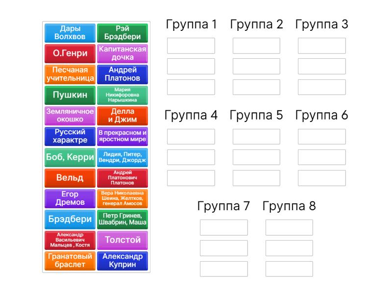 Группа 1: Толстой, Русский характре, Егор Дремов, Группа 2: Андрей Платонов, В прекрасном и яростном мире, Александр Васильевич Мальцев , Костя, Группа 3: Андрей Платонович Платонов, Песчаная учительница, Мария Никифоровна Нарышкина, Группа 4: Пушкин, Капитанская дочка, Петр Гринев, Швабрин, Маша, Группа 5: О.Генри, Дары Волхвов, Делла и Джим, Группа 6: Рэй Брэдбери, Земляничное окошко, Боб, Керри, Группа 7: Брэдбери, Вельд, Лидия, Питер, Вендри, Джордж, Группа 8: Александр Куприн, Гранатовый браслет, Вера Николаевна Шеина, Желтков, генерал Амосов,