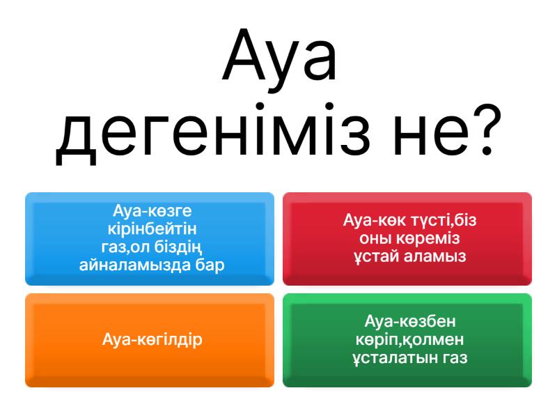 1) Ауа дегеніміз не? a) Ауа-көзге кірінбейтін газ,ол біздің айналамызда бар b) Ауа-көк түсті,біз оны көреміз ұстай аламыз c) Ауа-көгілдір d) Ауа-көзбен көріп,қолмен ұсталатын газ 2) Ауаны көре аламызба? a) Ия көріп,ұстай аламыз b) Жоқ,өйткені ауа түссіз 3) Ауаның түсі бар м? a) Ауаның түсі жоқ,ол мөлдір b) Ауаның түсі бар,ол көк түсті 4) Ауаның иісі бар ма? a) Ия біз ауаны иіскей аламыз b) Жоқ,ауаның иісі болмайды 5) Ауа қайда болады? a) Ауа мүлдем болмайды,ауасыз өмір сүре аламыз b) Ауа жердің барлық жерінде,бізді қоршап тұрады 6) Ауасыз өмір сүруге бола ма? a) Жоқ,ауасыз адамдар,жануарлар және өсімдіктер өмір сүре алмайды b) Ауасыз өмір бар,тіршілік ауасыз өмір сүре алады 7) Ауа адамдарға не үшін қажет? a) Адамдар дем алу үшін ауаны пайдаланады b) Ауа адамдарға керек емес 8) Ауа жануарлар мен өсімдіктерге не үшін қажет? a) Ауа әлемге керек емес,жануарлар және өсімдіктер ауасыз өмір сүре алады b) Жануарлар дем алады,ал өсімдктер ауадан көмірқышқыл газын сіңіреді 9) Ауа ауыр ма,әлде жеңіл ме? a) Ауа өте жеңіл,бірақ оның салмағы бар b) Ауаның салмағы жоқ 10) Ауаны қалай ұстап көруге болады? a) Ауа ұсталмайды b) Ауаны ұстап көру үшін шардыүрлеуге болады.Шардың ішінде ауа бар екені байқалады 11) Ауа неге қажет? a) Ауа дем алу,жану тірі табиғат үшін қажет b) Ауаның қажеті жоқ 12) Ауаның ішінде не бар? a) Ауаның ішнде оттегі,азат бар b) Ауада ештеңе жоқ 13) Ауаны не ластайды? a) Ауа көзге көрінбейді,сол үшін ластанбайды b) Зауытта түтіні,көлік газдары және қоқыстар ауаны ластайды 14) Ауаны қалай таза ұстауға болады? a) Көбірек ағаш отырғызу және зауыттар мен көліктерден шығатын түтінді азайту қажет b) Ауаны таза ұстамауға болады