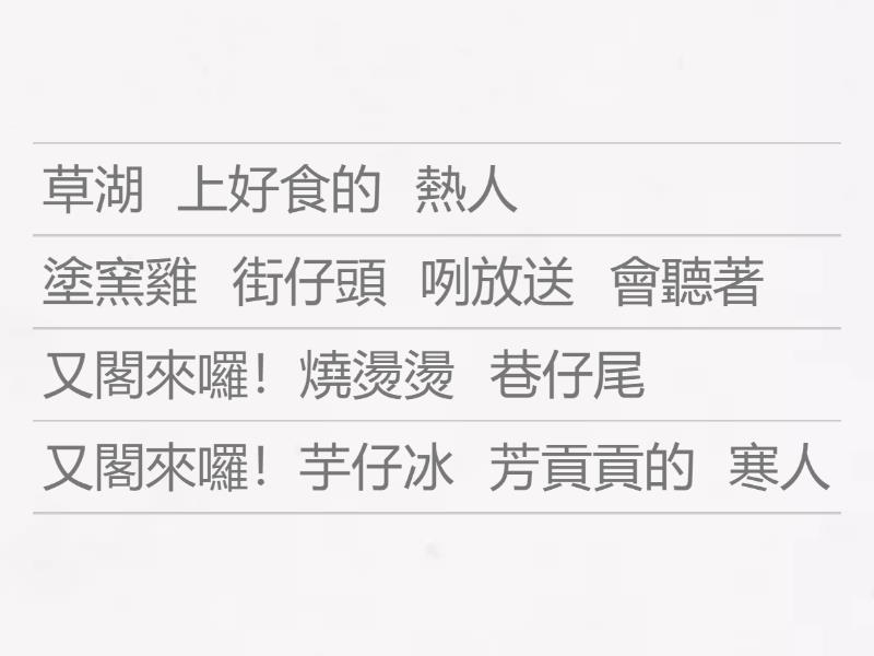 熱人 街仔頭 咧放送 上好食的 草湖 芋仔冰 又閣來囉! 寒人 巷仔尾 會聽著 燒燙燙 芳貢貢的 塗窯雞 又閣來囉! , 時間 若到 就出現 食飽 食巧 在人愛 食甜 食鹹 在你揀,