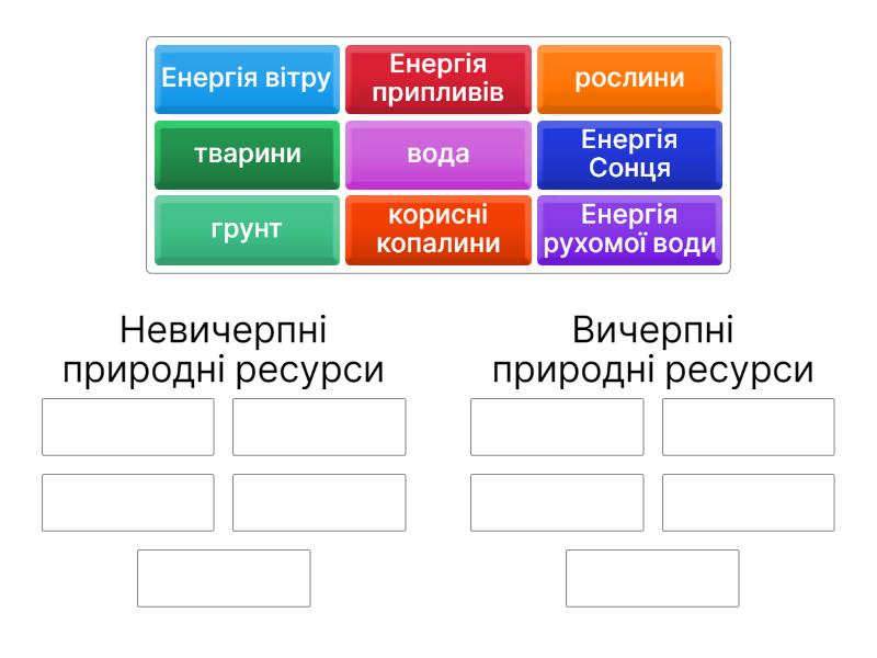 Невичерпні природні ресурси: Енергія Сонця, Енергія вітру, Енергія рухомої води, Енергія припливів, Вичерпні природні ресурси: корисні копалини, тварини, рослини, вода, грунт,
