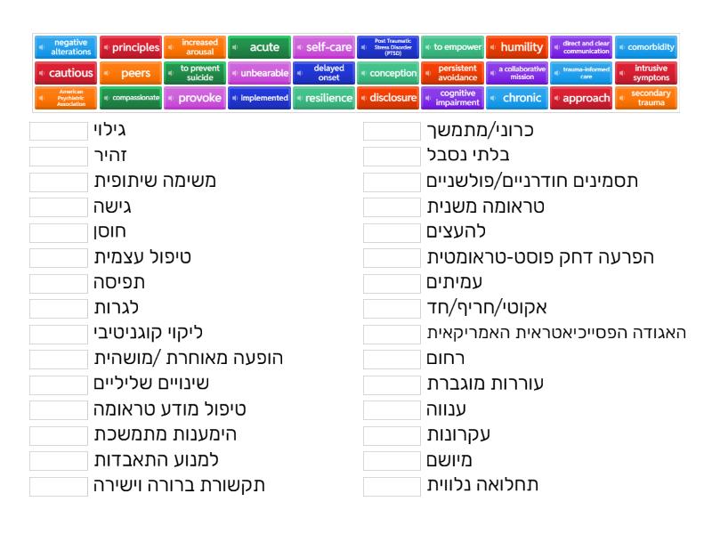 trauma-informed care - טיפול מודע טראומה, approach - גישה, implemented - מיושם, a collaborative mission - משימה שיתופית, disclosure - גילוי, humility - ענווה, cognitive impairment - ליקוי קוגניטיבי, conception - תפיסה, peers - עמיתים, cautious - זהיר, secondary trauma - טראומה משנית, self-care - טיפול עצמית, provoke - לגרות, unbearable - בלתי נסבל, resilience - חוסן, to prevent suicide - למנוע התאבדות, principles - עקרונות, to empower - להעצים, direct and clear communication - תקשורת ברורה וישירה, compassionate - רחום, American Psychiatric Association - האגודה הפסייכיאטראית האמריקאית, intrusive symptons - תסמינים חודרניים/פולשניים, increased arousal - עוררות מוגברת, negative alterations - שינויים שליליים, persistent avoidance - הימענות מתמשכת, comorbidity - תחלואה נלווית, acute - אקוטי/חריף/חד, chronic - כרוני/מתמשך, delayed onset - הופעה מאוחרת /מושהית, Post Traumatic Stress Disorder (PTSD) - הפרעה דחק פוסט-טראומטית,