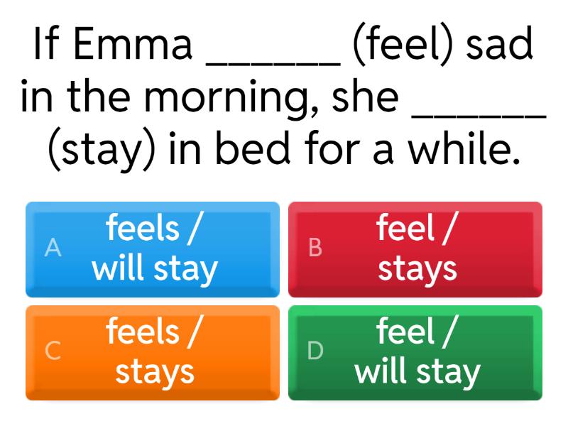 1) If Emma ______ (feel) sad in the morning, she ______ (stay) in bed for a while. a) feels / will stay b) feel / stays c) feels / stays d) feel / will stay 2) If she ______ (stay) in bed, her best friend Lily ______ (call) her to check in. a) stays / calls b) will stay / will call c) stays / will call d) stay / call 3) If Lily ______ (hear) that Emma is feeling down, she ______ (invite) her over for coffee. a) hears / invites b) hears / will invite c) hear / will invite d) hear / invites 4) What if Emma ______ (try) to talk to Lily about how she feels? Maybe that ______ (help) her. a) tries / will help b) try / helps c) tries / helps d) will try / will help 5) They ______ (talk) and share some funny stories if Emma ______ (go) to Lily’s house. a) talk / goes b) will talk / go c) will talk / goes d) talk / will go 6) If Emma ______ (start) laughing, she ______ (feel) a little better. a) starts / will feel b) start / feels c) starts / feels d) will start / will feel 7) If Lily ______ (suggest) doing something else, Emma ______ (probably) feel better. a) suggests / probably feel b) suggest / will probably feel c) suggests / will probably feel d) will suggest / will probably feel 8) If Lily ______ (notice) Emma smiling, she ______ (suggest) inviting their friends over. a) notices / will suggest b) notice / suggests c) notices / suggests d) will notice / will suggest 9) If they ______ (bring) board games, they ______ (have) a great time. a) bring / will have b) brings / have c) will bring / will have d) bring / have 10) If their friends ______ (come), they ______ (bring) snacks and board games. a) will come / will bring b) comes / bring c) come / will bring d) come / brings 11) Everyone ______ (have) a great time if they ______ (play) board games together. a) will have / play b) have / will play c) will have / will play d) have / play 12) If Emma ______ (win) a game, she ______ (feel) proud of herself. a) win / feels b) wins / feels c) wins / will feel d) will win / will feel 13) Emma ______ (realize) how lucky she is to have such caring friends if the evening ______ (go) well. a) will realize / goes b) go / will realize c) goes / will realize d) will go / will realize 14) If Emma ______ (have) a chance to talk to her friends, she ______ (realize) she’s not alone. a) has / will realize b) have / realizes c) has / realizes d) will have / realizes