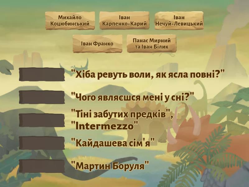 Іван Нечуй-Левицький - "Кайдашева сім'я", Панас Мирний та Іван Білик - "Хіба ревуть воли, як ясла повні?", Іван Карпенко-Карий - "Мартин Боруля", Іван Франко - "Чого являєшся мені у сні?", Михайло Коцюбинський - "Тіні забутих предків", "Intermezzo",