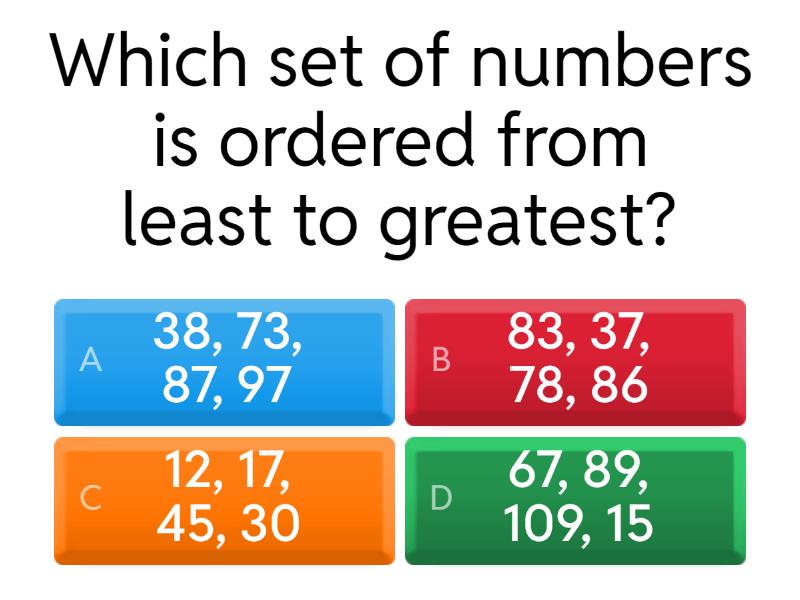 1) Which set of numbers is ordered from least to greatest? a) 38, 73, 87, 97 b) 83, 37, 78, 86 c) 12, 17, 45, 30 d) 67, 89, 109, 15 2) Are these numbers in order from least to greatest?145 367 654 868 986 a) no b) yes c) maybe d) not sure 3) Put these numbers in the correct order from greatest to least 101, 110, 76, 54 a) 54, 76, 110, 101 b) 54, 76, 101, 110 c) 110, 101, 76, 54 d) 76,45, 101, 110 4) Order these numbers from least to greatest 507,499,602,303 a) 507,499,602,303 b) 602,507,399,303 c) 303,399,507,602 d) 303,507,399,602 5) Place these numbers in order from greatest to least: 978 637 923 254 164 a) 164 254 637 923 978 b) 978 923 637 254 164 c) 978 923 164 254 637 d) 978 254 637 164 923