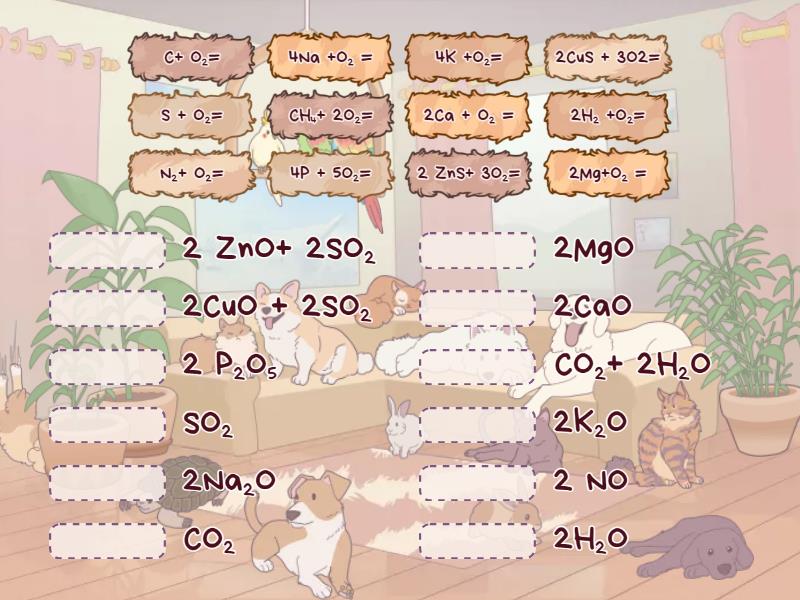 4P + 5O2=  - 2 P2O5, S + O2= - SO2, C+ O2= - CO2, N2+ O2= - 2 NO, CH4+ 2O2= - CO2+ 2H2O, 2 ZnS+ 3O2=  - 2 ZnO+ 2SO2, 2CuS + 3O2= - 2CuO + 2SO2, 2H2 +O2= - 2H2O, 2Ca + O2 = - 2CaO, 2Mg+O2 = - 2MgO, 4Na +O2 = - 2Na2O, 4K +O2= - 2K2O,