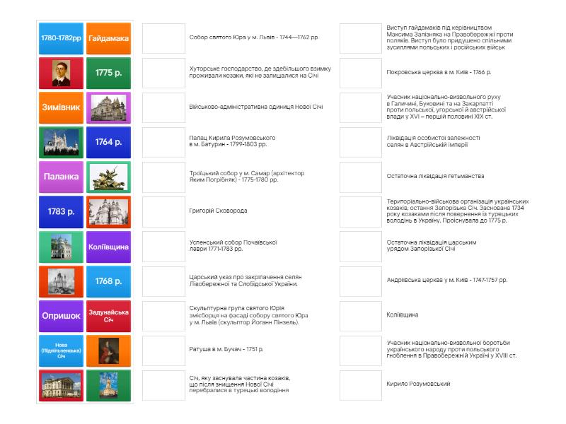 1764 р. - Остаточна ліквідація гетьманства, 1768 р. - Коліївщина, 1775 р. - Остаточна ліквідація царським урядом Запорізької Січі, 1780-1782рр - Ліквідація особистої залежності селян в Австрійській імперії, 1783 р. - Царський указ про закріпачення селян Лівобережної та Слобідської України., Кирило Розумовський, Григорій Сковорода, Опришок - Учасник національно-визвольного руху в Галичині, Буковині та на Закарпатті проти польської, угорської й австрійської влади у ХVІ – першій половині ХІХ ст., Нова (Підпільненська) Січ - Територіально-військова організація українських козаків, остання Запорізька Січ. Заснована 1734 року козаками після повернення із турецьких володінь в Україну. Проіснувала до 1775 р., Паланка - Військово-адміністративна одиниця Нової Січі, Зимівник - Хуторське господарство, де здебільшого взимку проживали козаки, які не залишалися на Січі, Задунайська Січ - Січ, яку заснувала частина козаків, що після знищення Нової Січі перебралися в турецькі володіння, Гайдамака - Учасник національно-визвольної боротьби українського народу проти польського гноблення в Правобережній Україні у ХVІІІ ст., Коліївщина - Виступ гайдамаків під керівництвом Максима Залізняка на Правобережжі проти поляків. Виступ було придушено спільними зусиллями польських і російських військ, Собор святого Юра у м. Львів - 1744—1762 рр, Андріївська церква у м. Київ - 1747-1757 рр. , Ратуша в м. Бучач - 1751 р., Покровська церква в м. Київ - 1766 р., Троїцький собор у м. Самар (архітектор Яким Погрібняк) - 1775-1780 рр., Успенський собор Почаївської лаври 1771-1783 рр., Палац Кирила Розумовського в м. Батурин - 1799-1803 рр., Скульптурна група святого Юрія змієборця на фасаді собору святого Юра у м. Львів (скульптор Йоганн Пінзель).,