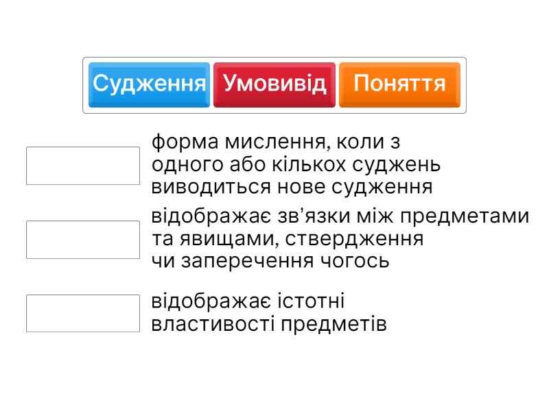 Поняття - відображає істотні властивості предметів, Судження - відображає зв’язки між предметами та явищами, ствердження чи заперечення чогось, Умовивід - форма мислення, коли з одного або кількох суджень виводиться нове судження,