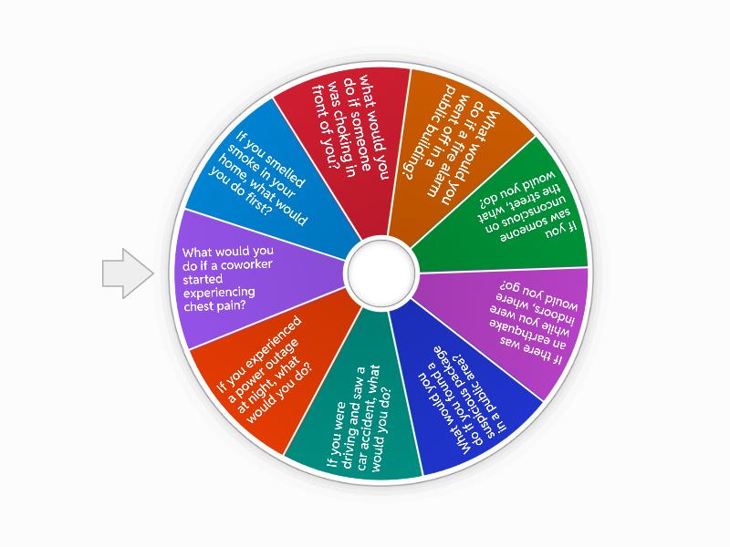 1) If you smelled smoke in your home, what would you do first? 2) what would you do if someone was choking in front of you? 3) What would you do if a fire alarm went off in a public building? 4) If you saw someone unconscious on the street, what would you do? 5) If there was an earthquake while you were indoors, where would you go? 6) What would you do if you found a suspicious package in a public area? 7) If you were driving and saw a car accident, what would you do? 8) If you experienced a power outage at night, what would you do? 9) What would you do if a coworker started experiencing chest pain?