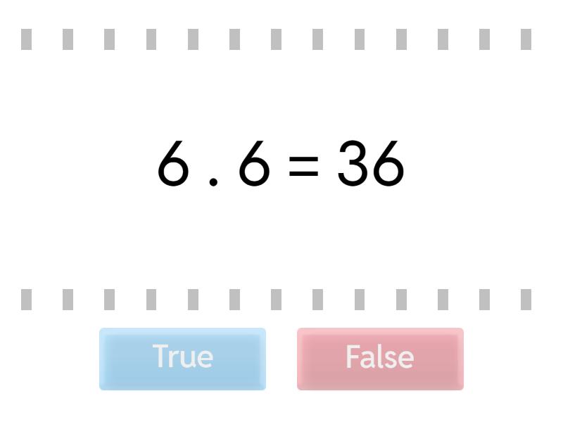 True: 6 . 6 = 36, 4 . 8 = 32, 9 . 7 = 63, 8 . 7 = 56, 3 . 4 = 12, 7 . 7 = 49, 9 . 8 = 72, 5 . 4 = 20, 4 . 6 = 24, 7 . 4 = 28, 2 . 9 = 18, 8 . 5 = 40, 3 . 8 = 24, 9 . 6 = 54, 7 . 5 = 35, 6 . 5 = 30, 8 . 8 = 64, 6 . 3 = 18, 9 . 3 = 27, 8 . 6 = 48, 9 . 5 = 45, 2 . 8 = 16, 3 . 7 = 21, 6 . 7 = 42, 5 . 5 = 25, 4 . 4 = 16, 9 . 9 = 81, 5 . 3 = 15, 2 . 6 = 12, 9 . 4 = 36, False: 9 . 9 = 72, 5 . 7 = 30, 4 . 3 = 15, 5 . 6 = 35, 9 . 4 = 32, 3 . 7 = 19, 9 . 3 = 21, 6 . 8 = 63, 8 . 8 = 56, 7 . 6 = 49, 8 . 5 = 45, 5 . 5 = 16, 5 . 4 = 9, 7 . 4 = 31, 8 . 4 = 28, 7 . 9 = 56, 8 . 3 = 25, 4 . 6 = 36, 8 . 7 = 52, 4 . 4 = 25, 8 .9 = 53, 7 . 7 = 48, 9 . 5 = 40, 6 . 6 = 54, 6 . 9 = 53,