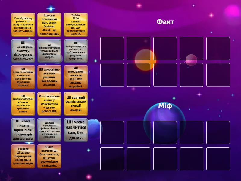 Факт: YouTube, TikTok та Netflix використовують ШІ, щоб рекомендувати контент., Голосові помічники (Siri, Google Assistant, Alexa) – це приклади ШІ., Розпізнавання облич у смартфонах – це теж робота ШІ., ШІ може створювати фейкові відео та голоси, які складно відрізнити від справжніх., ШІ використовується у медицині для діагностики хвороб., ШІ може писати вірші, пісні та сценарії для фільмів., У шахах ШІ давно перевершив найкращих гравців-людей., ШІ здатний розпізнавати емоції людей., ШІ використовується у відеоіграх, щоб створювати розумних суперників., ШІ використовується в банках для аналізу кредитних заявок., Міф: ШІ вже здатен повністю замінити людину на роботі., ШІ може навчитися сам, без даних., Якщо навчити ШІ багато читати, він стане розумнішим за людину., ШІ – це загроза людству, бо скоро він захопить світ., ШІ самостійно ухвалює рішення без впливу людини., ШІ може самостійно навчитися малювати без втручання людини., У майбутньому роботи з ШІ стануть повністю самостійними і замінять людей.,