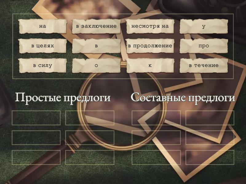 Простые предлоги: в, о, на, к, про, у, Составные предлоги: в течение, в заключение, несмотря на, в силу, в продолжение, в целях,