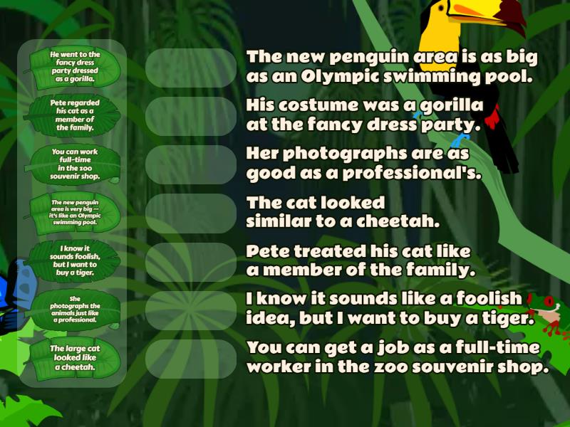 The large cat looked like a cheetah. - The cat looked similar to a cheetah., I know it sounds foolish, but I want to buy a tiger. - I know it sounds like a foolish idea, but I want to buy a tiger., You can work full-time in the zoo souvenir shop. - You can get a job as a full-time worker in the zoo souvenir shop., The new penguin area is very big -- it's like an Olympic swimming pool. - The new penguin area is as big as an Olympic swimming pool., She photographs the animals just like a professional. - Her photographs are as good as a professional's., He went to the fancy dress party dressed as a gorilla. - His costume was a gorilla at the fancy dress party., Pete regarded his cat as a member of the family. - Pete treated his cat like a member of the family.,