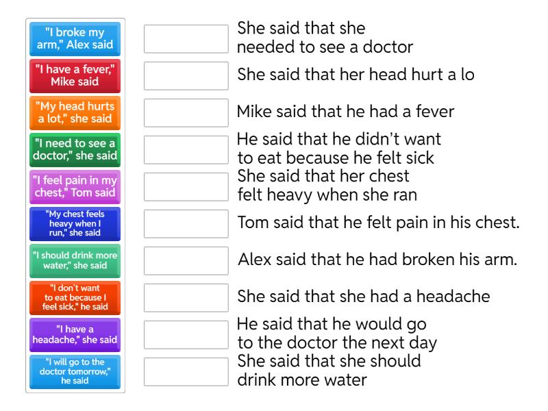 "I have a headache," she said - She said that she had a headache, "I feel pain in my chest," Tom said - Tom said that he felt pain in his chest., "I broke my arm," Alex said - Alex said that he had broken his arm., "I need to see a doctor," she said - She said that she needed to see a doctor, "I have a fever," Mike said - Mike said that he had a fever, "My head hurts a lot," she said - She said that her head hurt a lo, "I will go to the doctor tomorrow," he said - He said that he would go to the doctor the next day, "I should drink more water," she said - She said that she should drink more water, "I don’t want to eat because I feel sick," he said - He said that he didn’t want to eat because he felt sick, "My chest feels heavy when I run," she said - She said that her chest felt heavy when she ran,