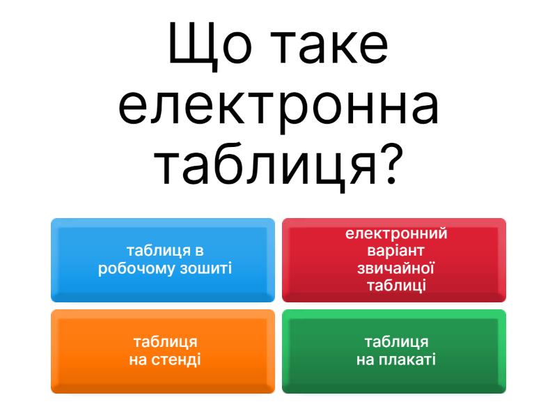 1) Що таке електронна таблиця? a) таблиця в робочому зошиті b) електронний варіант звичайної таблиці c) таблиця на стенді d) таблиця на плакаті 2) Табличний процесор - це... a) програма, яка призначена для опрацювання даних в електронних таблицях b) програма, яка призначена для роботи з графічними даними онлайн c) програма, яка призначена для опрацювання текстових даних d) програма для створення та редагування текстових даних та зображень 3) За допомогою якого ярлика запускається Microsoft Excel? a) b) c) d) 4) Адреса клітинки складається з... a) двокрапки b) символа @ c) назвою стовпця та номера рядка d) логіна та пароля 5) Обери правильно записану адресу клітинки: a) 54S b) A1 c) 5:A d) В_24 6) Деяка сукупність клітинок аркуша електронної книги утворює... a) ряд клітинок b) групу клітинок c) колону клітинок d) діапазон клітинок 7) Вкажіть запис діапазону зображений на малюнку a) С2,Е3 b) С2:Е3 c) С2:Е2 d) С2-Е2 8) Вираз, що може містити числові дані, адреси клітинок, функції та знаки арифметичних операцій – … a) рівняння b) нерівність c) формула d) діаграма 9) Запис формули в електронній таблиці починається з... a) = b) : c) % d) $ 10) Яким знаком зображується дія ділення? a) : b) / c) * d) + 11) Який результат обчислень у комірці B1? a) 18 b) 80 c) 20 d) 72 12) Який результат обчислень у комірці B1? a) 18 b) 80 c) 20 d) 72 13) Який результат обчислень у комірці B1? a) 18 b) 80 c) 20 d) 72 14) Який результат обчислень у комірці B1? a) 18 b) 80 c) 20 d) 72 15) Яка діаграма зображена на малюнку? a) Секторна b) Стовпчаста