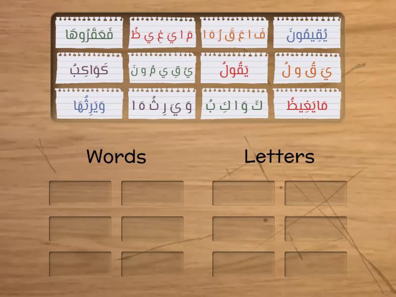 Words: مَايَغِيظُ, كَوَاكِبُ, وَيَرِثُهَا, فَعَقَرُوهَا, يَقُولُ, يُقِيمُونَ, Letters: مَ ا يَ غِ ي ظُ, كَ وَ ا كِ بُ, وَ يَ رِ ثُ هَ ا, فَ ا عَ قَ رُ هَ ا, يَ قُ و لُ, يُ قِ ي مُ و نَ,