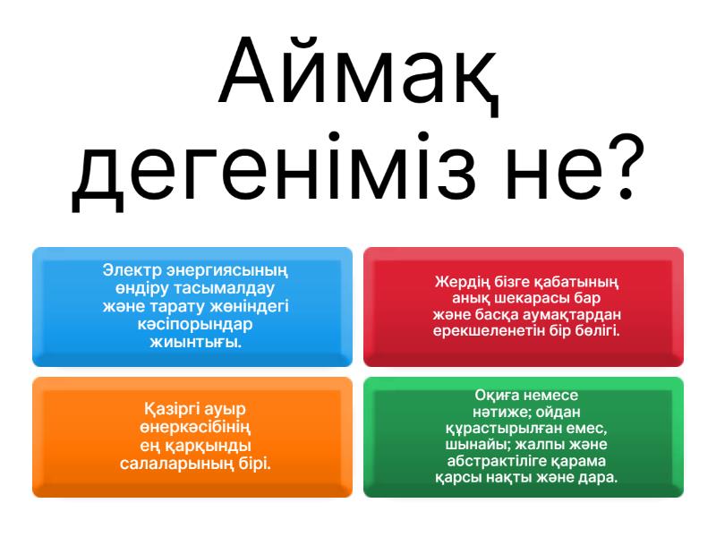 1) Аймақ дегеніміз не? a) Электр энергиясының өндіру тасымалдау және тарату жөніндегі кәсіпорындар жиынтығы. b) Жердің бізге қабатының анық шекарасы бар және басқа аумақтардан ерекшеленетін бір бөлігі. c) Қазіргі ауыр өнеркәсібінің ең қарқынды салаларының бірі. d) Оқиға немесе нәтиже; ойдан құрастырылған емес, шынайы; жалпы және абстрактіліге қарама қарсы нақты және дара. 2) Негізгі діни бағыттар нешеге бөлінеді? a) 4 b) 6 c) 3 d) 2 3) Ең жас дүниежүзілік дін? a) Буддизм b) Ислам c) Христиан d) Индуизм 4) Тіл дегеніміз не? a) Саяси бөліну немесе аумақтың саяси әкімшілік құрылымын білдіретін географиялық карта. b) Қандайда бір істе, шеберлікте, өнерде пайдаланылатын кәсіпқой амалдар жиынтығы. c) Адамдардың қарым-қатынасының, мәлімет сақтау және берудің маңызды құралы. d) Басқарылатын жағдайлардағы кейбір құбылыстардың зерттеу әдісі. 5) Ең ірі тілдер? a) Ағылшын, Қытай, Хинди тілдері. b) Тувалу, Селкүп, Шор тілдері. c) Сентинель, Ливон, Айну тілдері. d) Арчих, Хунзиб, Ленбонг тілдері. 6) Діннің қанша нысандары бар? a) 2 b) 3 c) 1 d) 4