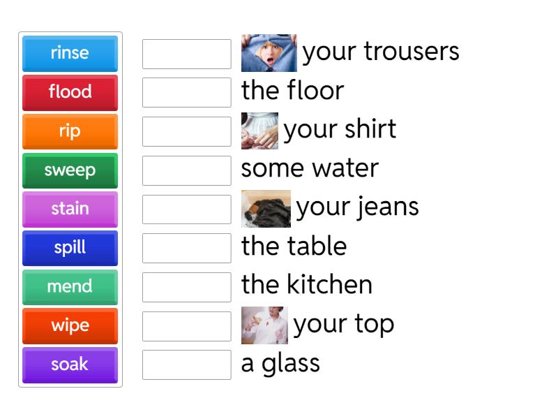 spill - some water, rip - your trousers, soak - your jeans, stain - your top, mend - your shirt, flood - the kitchen, sweep - the floor, rinse - a glass, wipe - the table,