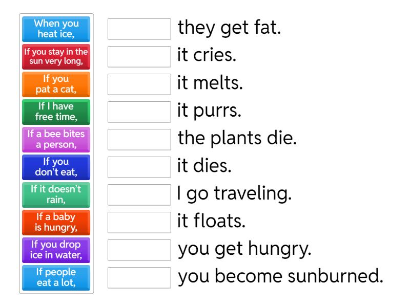 When you heat ice, - it melts., If you don’t eat, - you get hungry., If it doesn’t rain, - the plants die., If you drop ice in water, - it floats., If a bee bites a person, - it dies., If people eat a lot, - they get fat., If you stay in the sun very long, - you become sunburned., If a baby is hungry, - it cries., If I have free time, - I go traveling., If you pat a cat, - it purrs.,