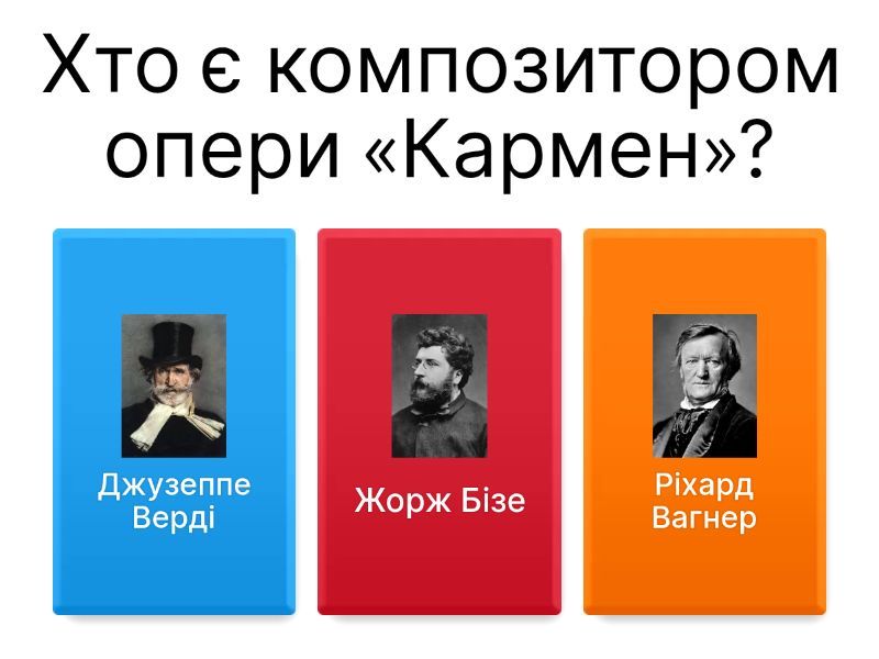 1) Хто є композитором опери «Кармен»? a) Джузеппе Верді b) Жорж Бізе c) Ріхард Вагнер  2) На основі якого літературного твору написана опера «Кармен»? a) Новели Проспера Меріме b) П'єси Вільяма Шекспіра c) Роману Віктора Гюго 3) До якого жанру належить опера «Кармен»? a) Гранд-опера b) Опера-комік c) Ораторія 4) Скільки дій має опера «Кармен»? a) Три b) Чотири c) П’ять 5) Чому прем'єра опери «Кармен» зазнала невдачі? a) Опера була невписувалась в уявлення глядачів, груба та шокуюча  b) Опера виявилася надто довгою для глядачів (4 акти) c) Музика була занадто складною для виконання 6) Як відреагував Бізе на провал опери «Кармен»? a) Переїхав до Італії та відмовився від творчості b) Написав другу версію опери, яка стала успішною c) Захворів і невдовзі помер у 36 років 7) Які основні теми пронизує опера «Кармен»? a) Кохання і ревнощі b) Доля (рок) і пристрасть c) Свобода і революція 8) Дія опери відбувається в: a) Італії b) Франції c) Іспанії 9) Головна героїня Кармен працює: a) Співачкою в кабаре у Севільї b) Працівницею на сигаретній фабриці c) Циганкою 10) Як звати головного чоловічого персонажа, який кохає Кармен? a) Ескамільйо b) Дон Хозе c) Мікаела 11) Який персонаж є суперником Дон Хозе? a) Мефістофель b) Мікаела c) Ескамільйо 12) Чим закінчується опера? a) Кармен тікає разом з Дон Хозе b) Дон Хозе вбиває Кармен c) Кармен виходить заміж за Ескамільйо