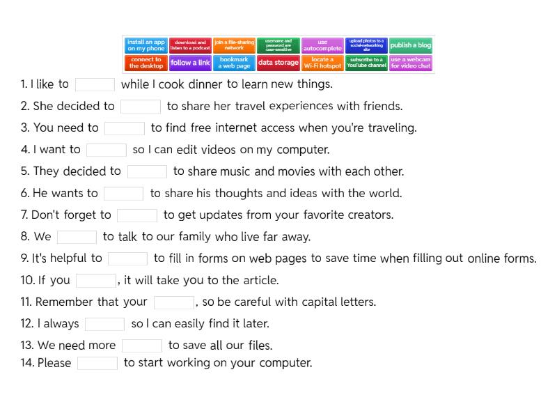 1. I like to ____ while I cook dinner to learn new things. 2. She decided to ____ to share her travel experiences with friends. 3. You need to ____ to find free internet access when you're traveling. 4. I want to ____ so I can edit videos on my computer. 5. They decided to ____ to share music and movies with each other. 6. He wants to ____ to share his thoughts and ideas with the world. 7. Don't forget to ____ to get updates from your favorite creators. 8. We ____ to talk to our family who live far away. 9. It's helpful to ____ to fill in forms on web pages to save time when filling out online forms. 10. If you ____, it will take you to the article. 11. Remember that your ____, so be careful with capital letters. 12. I always ____ so I can easily find it later. 13. We need more ____ to save all our files. 14. Please ____ to start working on your computer.