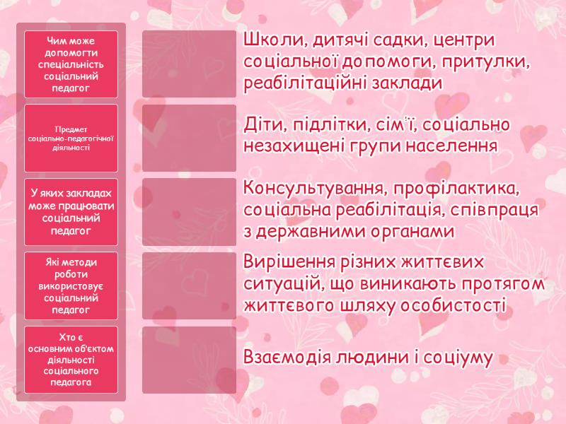 Предмет соціально-педагогічної діяльності - Взаємодія людини і соціуму, Чим може допомогти спеціальність соціальний педагог - Вирішення різних життєвих ситуацій, що виникають протягом життєвого шляху особистості, Хто є основним об'єктом діяльності соціального педагога - Діти, підлітки, сім’ї, соціально незахищені групи населення, Які методи роботи використовує соціальний педагог - Консультування, профілактика, соціальна реабілітація, співпраця з державними органами, У яких закладах може працювати соціальний педагог - Школи, дитячі садки, центри соціальної допомоги, притулки, реабілітаційні заклади,