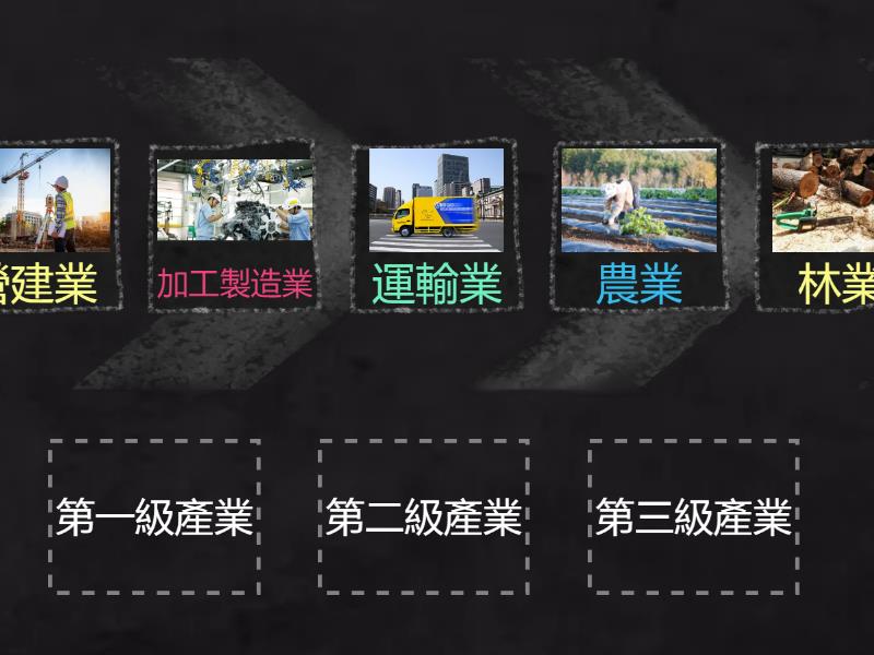 第一級產業: 農業, 林業, 漁業, 畜牧業, 第二級產業: 紡織業, 加工製造業, 營建業, 第三級產業: 商業, 運輸業, 金融業, 觀光業,