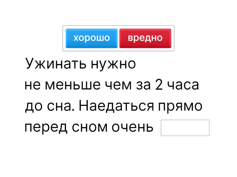Ужинать нужно не меньше чем за 2 часа до сна. Наедаться прямо перед сном очень ____ Не надо есть много жареного, копченого, соленого, острого. Такая пища может быть очень вкусной, но ____ пища не должна быть очень ____ утром перед школой ____ сладостей нужно есть как можно меньше. В этой пище много ____