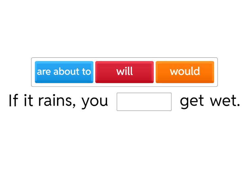 If it rains, you ____ get wet. If you freeze water, it ____ solid. If Sally ____ late again I will be mad If you ____ hurry, you will miss the bus Nobody ____ notice if you make a mistake. If you ____ leave, I'll call the police. If you drop that glass, it ____ break.